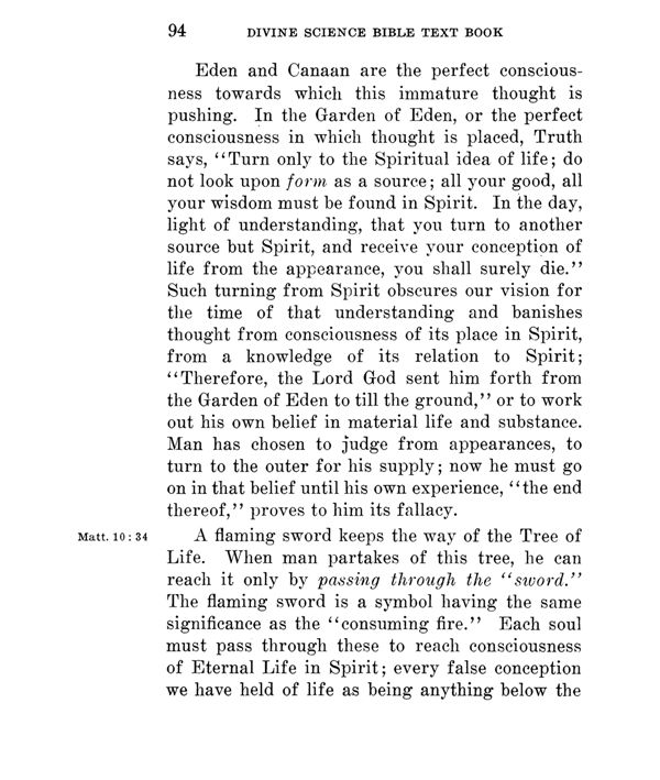 Eden and Canaan are the perfect consciousness towards which this immature thought is pushing. In the Garden of Eden, or the perfect consciousness in which thought is placed, Truth says, "Turn only to the Spiritual idea of life; do not look upon form as a source; all your good, all your wisdom must be found in Spirit. In the day, light of understanding, that you turn to another source but Spirit, and receive your conception of life from the appearance, you shall surely die." Such turning from Spirit obscures our vision for the time of that understanding and banishes thought from consciousness of its place in Spirit, from a knowledge of its relation to Spirit; "Therefore, the Lord God sent him forth from the Garden of Eden to till the ground," or to work out his own belief in material life and substance. Man has chosen to judge from appearances, to turn to the outer for his supply; now he must go on in that belief until his own experience, "the end thereof," proves to him its fallacy.