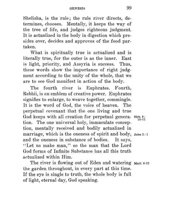 The river is flowing out of Eden and watering the garden throughout, in every part at this time. If the eye is single to truth, the whole body is full of light, eternal day, God speaking.