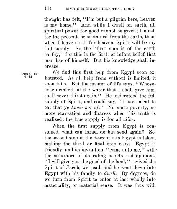 We find this first help from Egypt soon exhausted. As all help from without is limited, it soon fails. But the master of life says, "Whosoever drinketh of the water that I shall give him, shall never thirst again." He understood the full supply of Spirit, and could say, "I have pleat to eat that ye know not of." No more poverty, no more ,starvation and distress when this truth is realized; the true supply is for all alike.