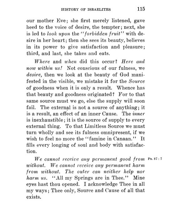 Where and when did this occur? Here and now within us! Not conscious of our fulness, we desire, then we look at the beauty of God manifested in the visible, we mistake it for the Source of goodness when it is only a result. Whence has that beauty and goodness originated? For to that same source must we go, else the supply will soon fail. The external is not a source of anything; it is a result, an effect of an inner Cause. The inner is inexhaustible; it is the source of supply to every external thing. To that Limitless Source we must turn wholly and see its fulness omnipresent, if we wish to feel no more the "famine in Canaan." It fills every longing of soul and body with satisfaction.