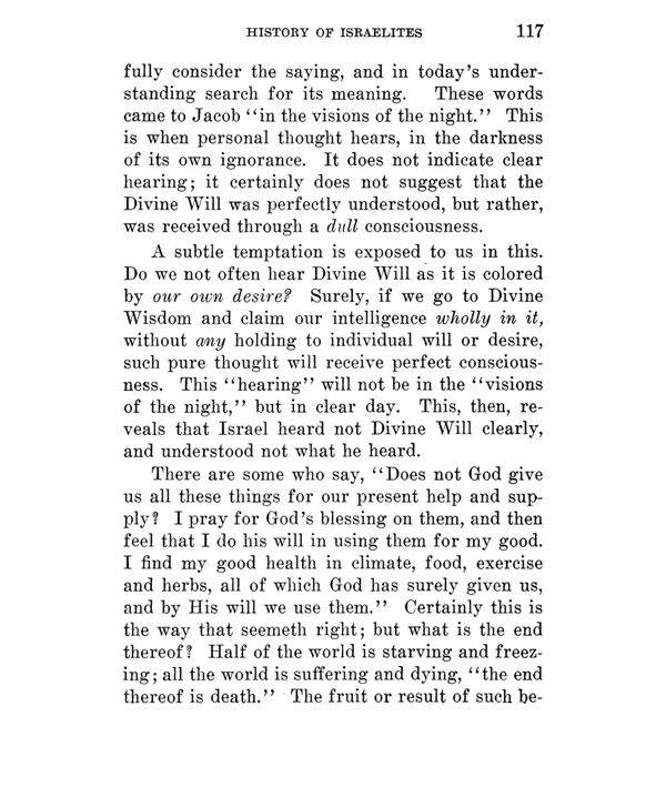A subtle temptation is exposed to us in this. Do we not often hear Divine Will as it is colored by our own desire? Surely, if we go to Divine Wisdom and claim our intelligence wholly in it, without any holding to individual will or desire, such pure thought will receive perfect consciousness. This "hearing" will not be in the "visions of the night," but in clear day. This, then, reveals that Israel heard not Divine Will clearly, and understood not what he heard.