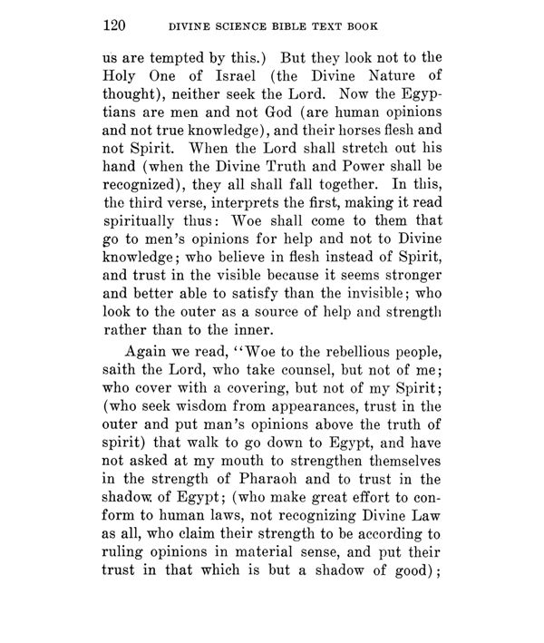 Again we read, "Woe to the rebellious people, saith the Lord, who take counsel, but not of me; who cover with a covering, but not of my Spirit; (who seek wisdom from appearances, trust in the outer and put man's opinions above the truth of spirit) that walk to go down to Egypt, and have not asked at my mouth to strengthen themselves in the strength of Pharaoh and to trust in the shadow of Egypt; (who make great effort to conform to human laws, not recognizing Divine Law as all, who claim their strength to be according to ruling opinions in material sense, and put their trust in that which is but a shadow of good);