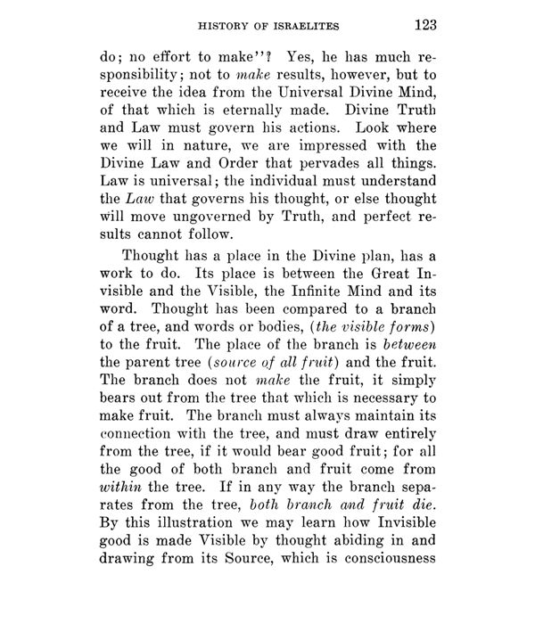 Thought has a place in the Divine plan, has a work to do. Its place is between the Great Invisible and the Visible, the Infinite Mind and its word. Thought has been compared to a branch of a tree, and words or bodies, (the visible forms) to the fruit. The place of the branch is between the parent tree (source of all fruit) and the fruit. The branch does not make the fruit, it simply bears out from the tree that which is necessary to make fruit. The branch must always maintain its connection with the tree, and must draw entirely from the tree, if it would bear good fruit; for all the good of both branch and fruit come from within the tree. If in any way the branch separates from the tree, both branch and fruit die. By this illustration we may learn how Invisible good is made Visible by thought abiding in and drawing from its Source, which is consciousness