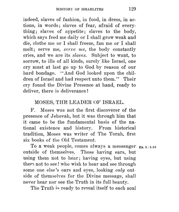 indeed, slaves of fashion, in food, in dress, in actions, in words; slaves of fear, afraid of everything; slaves of appetite; slaves to the body, which says feed me daily or I shall grow weak and die, clothe me or I shall freeze, fan me or I shall melt; serve me, serve me, the body constantly cries, and we are its slaves. Subject to want, to sorrow, to ills of all kinds, surely like Israel, one cry must at last go up to God by reason of our hard bondage. "And God looked upon the children of Israel and had respect unto them." Their cry found the Divine Presence at hand, ready to deliver, there is deliverance!