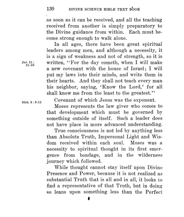 True consciousness is not led by anything less than Absolute Truth, Impersonal Light and Wisdom received within each soul. Moses was a necessity to spiritual thought in its first emergence from bondage, and in the wilderness journey which followed.