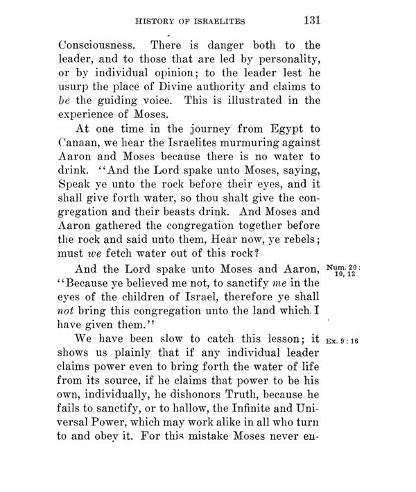 We have been slow to catch this lesson; it shows us plainly that if any individual leader claims power even to bring forth the water of life from its source, if he claims that power to be his own, individually, he dishonors Truth, because he fails to sanctify, or to hallow, the Infinite and Universal Power, which may work alike in all who turn to and obey it. For this mistake Moses never entered