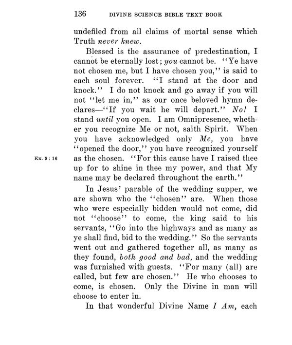 Blessed is the assurance of predestination, I cannot be eternally lost you cannot be. "Ye have not chosen me, but I have chosen you," is said to each soul forever. "I stand at the door and knock." I do not knock and go away if you will not "let me in," as our once beloved hymn declares --- "If you wait he will depart." No! I stand until you open. I am Omnipresence, whether you recognize Me or not, saith Spirit. When you have acknowledged only Me, you have "opened the door," you have recognized yourself