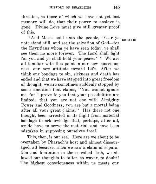 "And Moses said unto the people, 'Fear ye not; stand still, and see the salvation of God --- for the Egyptians whom ye have seen today, ye shall see them no more forever. The Lord shall fight for you and ye shall hold your peace.' " We are all familiar with this point in our new consciousness, our new attitude toward Life. After we think our bondage to sin, sickness and death has ended and that we have stepped into great freedom of thought, we are sometimes suddenly stopped by some condition that claims, " You cannot ignore me, for I prove to you that your possibilities are limited; that you are not one with Almighty Power and Goodness; you are but a mortal being after all your great claims." Has there not one thought been arrested in its flight from material bondage to acknowledge that, perhaps, after all, we do have to serve the material, and have been mistaken in supposing ourselves free?