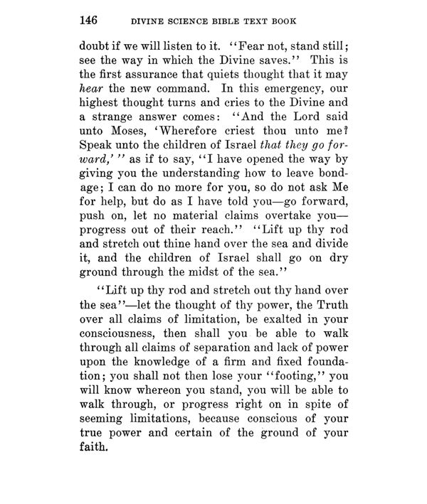 doubt if we will listen to it. "Fear not, stand still; see the way in which the Divine saves." This is the first assurance that quiets thought that it may hear the new command. In this emergency, our highest thought turns and cries to the Divine and a strange answer comes: "And the Lord said unto Moses, 'Wherefore criest thou unto me Speak unto the children of Israel that they go forward,' " as if to say, "I have opened the way by giving you the understanding how to leave bondage; I can do no more for you, so do not ask Me for help, but do as I have told you --- go forward, push on, let no material claims overtake you -- progress out of their reach." "Lift up thy rod and stretch out thine hand over the sea and divide it, and the children of Israel shall go on dry ground through the midst of the sea."
