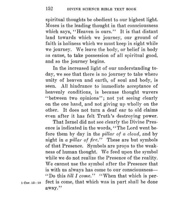 That Israel did not see clearly the Divine Presence is indicated in the words, "The Lord went before them by day in the pillar of a cloud, and by night in a, pillar of fire." These are but symbols of that Presence. Symbols are props to the weakness of human thought. We feed upon the symbol while we do not realize the Presence of the reality.