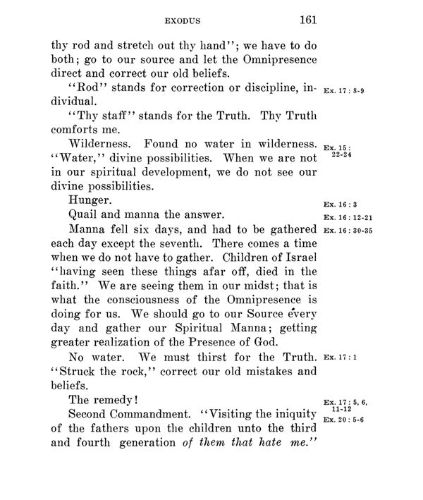 Hunger. Quail and manna the answer. Manna fell six days, and had to be gathered each day except the seventh. There comes a time when we do not have to gather. Children of Israel "having seen these things afar off, died in the faith." We are seeing them in our midst; that is what the consciousness of the Omnipresence is doing for us. We should go to our Source every day and gather our Spiritual Manna; getting greater realization of the Presence of God.