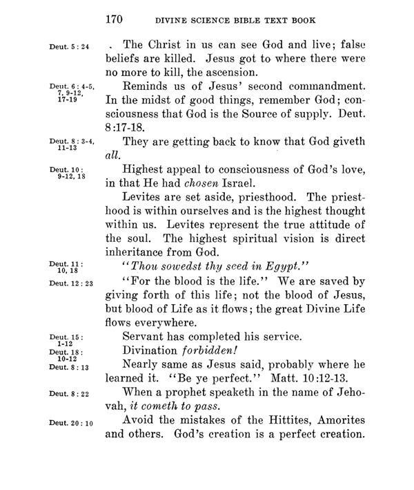 Deut. 5: 24 Deut. 6: 4-5,7, 9-12, 17-19 Deut. 8: 3-4, 11-13 Deut. 10: 9-12, 18 Deut. 11: 10, 18 Deut. 12: 23 Deut. 15: 1-12 Deut. 18: 10-12 Deut. 8: 13 Deut. 8: 22 Deut. 20: 10 |