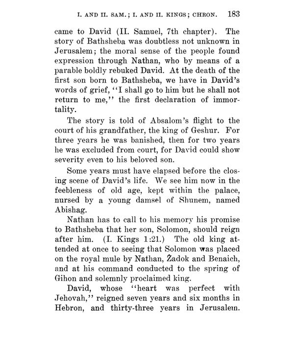 came to David (II. Samuel, 7th chapter). The story of Bathsheba was doubtless not unknown in Jerusalem the moral sense of the people found expression through Nathan, who by means of a parable boldly rebuked David. At the death of the first son born to Bathsheba, we have in David's words of grief, "I shall go to him but he shall not return to me," the first declaration of immortality.
