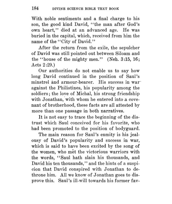 With noble sentiments and a final charge to his son, the good kind David, "the man after God's own heart," died at an advanced age. He was buried in the capital, which, received from him the name of the "City of David."