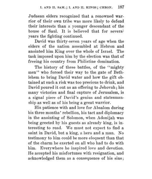 David was thirty-seven years of age when the elders of the nation assembled at Hebron and anointed him King over the whole of Israel. The task imposed upon him by the election was that of freeing his country from Philistine domination.