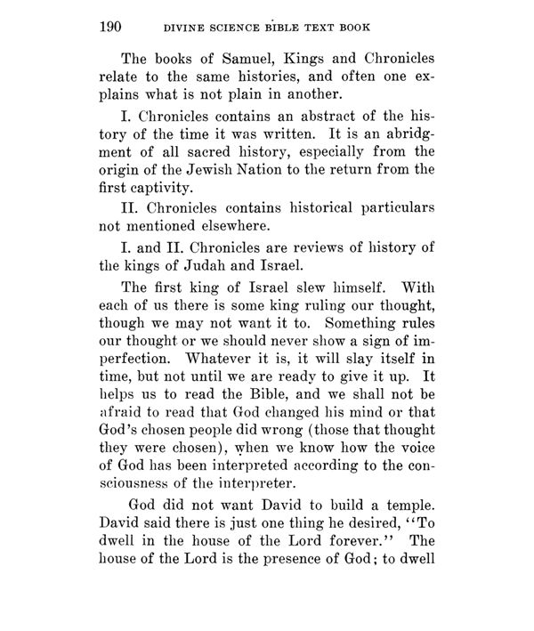 The first king of Israel slew himself. With each of us there is some king ruling our thought, though we may not want it to. Something rules our thought or we should never show a sign of imperfection. Whatever it is, it will slay itself in time, but not until we are ready to give it up. It helps us to read the Bible, and we shall not be afraid to read that God changed his mind or that God's chosen people did wrong (those that thought they were chosen), when we know how the voice of God has been interpreted according to the consciousness of the interpreter.