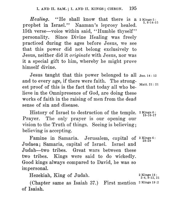 Healing. "He shall know that there is a prophet in Israel." Naaman's leprosy healed.15th verse --- voice within said, "Humble thyself" personality. Since Divine Healing was freely practiced during the ages before Jesus, we see that this power did not belong exclusively to Jesus, neither did it originate with Jesus, nor was it a special gift to him, whereby he might prove himself divine.