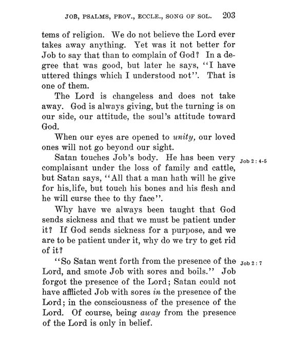 "So Satan went forth from the presence of the Lord, and smote Job with sores and boils." Job forgot the presence of the Lord; Satan could not have afflicted Job with sores in the presence of the Lord; in the consciousness of the presence of the Lord. Of course, being away from the presence of the Lord is only in belief.