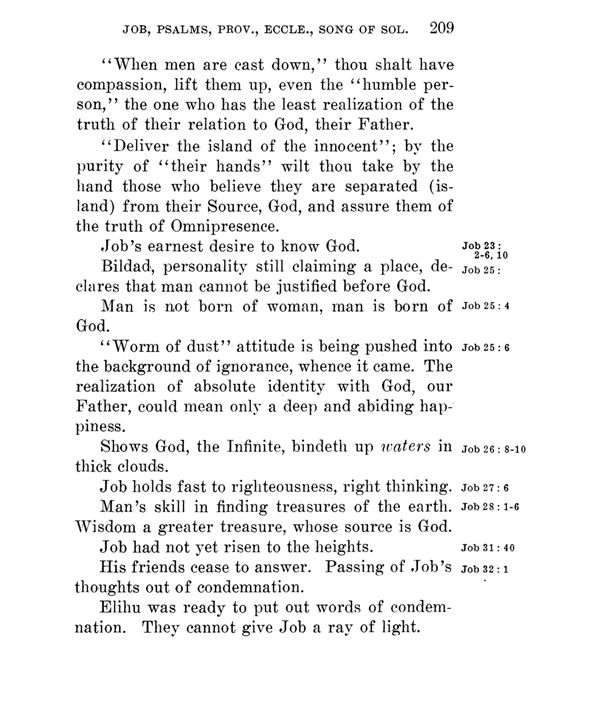 Job 23: 2-6, 10 Job 25: Job 25: 4 Job 25: 6 Job 26: 8-10 Job 27: 6 Job 28: 1-6 Job 31: 40 Job 32: 1 |