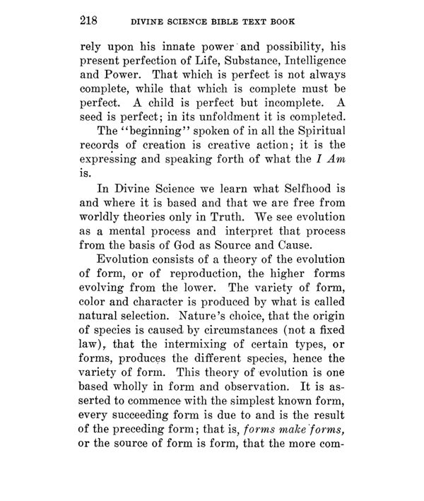 In Divine Science we learn what Selfhood is and where it is based and that we are free from worldly theories only in Truth. We see evolution as a mental process and interpret that process from the basis of God as Source and Cause.