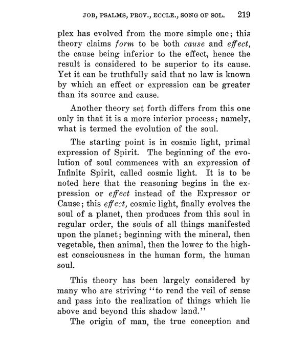 has evolved from the more simple one; this theory claims form to be both cause and effect, the cause being inferior to the effect, hence the result is considered to be superior to its cause. Yet it can be truthfully said that no law is known by which an effect or expression can be greater than its source and cause.