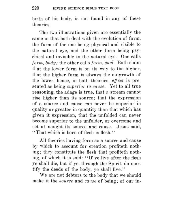The two illustrations given are essentially the same in that both deal with the evolution of form, the form of the one being physical and visible to the natural eye, and the other form being psychical and invisible to the natural eye. One calls form, body; the other calls form, soul. Both claim that the lower form is on its way to the higher, that the higher form is always the outgrowth of the lower, hence, in both theories, effect is presented as being superior to cause. Yet to all true reasoning, the adage is true, that a stream cannot rise higher than its source; that the expression of a source and cause can never be superior in quality or greater in quantity than that which has given it expression, that the unfolded can never become superior to the unfolder, or overcome and set at naught its source and cause. Jesus said, "That which is born of flesh is flesh."