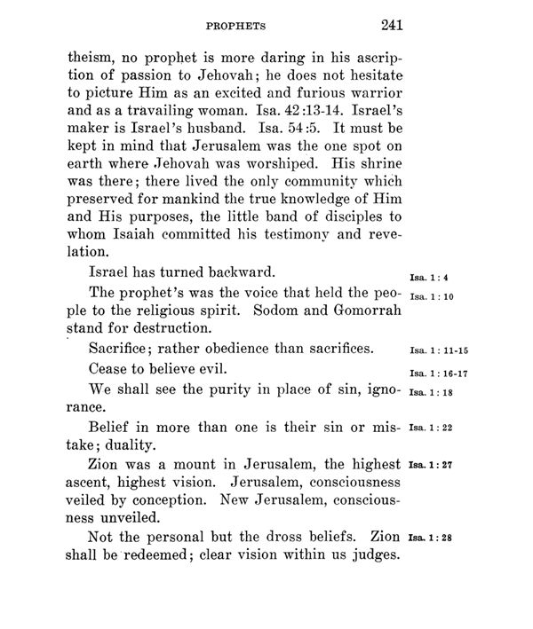 no prophet is more daring in his ascription of passion to Jehovah; he does not hesitate to picture Him as an excited and furious warrior and as a travailing woman. Isa. 42:13-14. Israel's maker is Israel's husband. Isa. 54:5. It must be kept in mind that Jerusalem was the one spot on earth where Jehovah was worshiped. His shrine was there; there lived the only community which preserved for mankind the true knowledge of Him and His purposes, the little band of disciples to whom Isaiah committed his testimony and revelation.