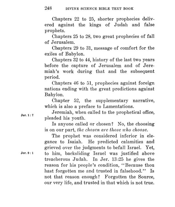The prophet was considered inferior in elegance to Isaiah. He predicted calamities and grieved over the judgments to befall Israel. Yet, to him, backsliding Israel was justified above treacherous Judah. In Jer. 13:25 he gives the reason for his people's condition, "Because thou hast forgotten me and trusted in falsehood." Is not that reason enough? Forgotten the Source, our very life, and trusted in that which is not true.