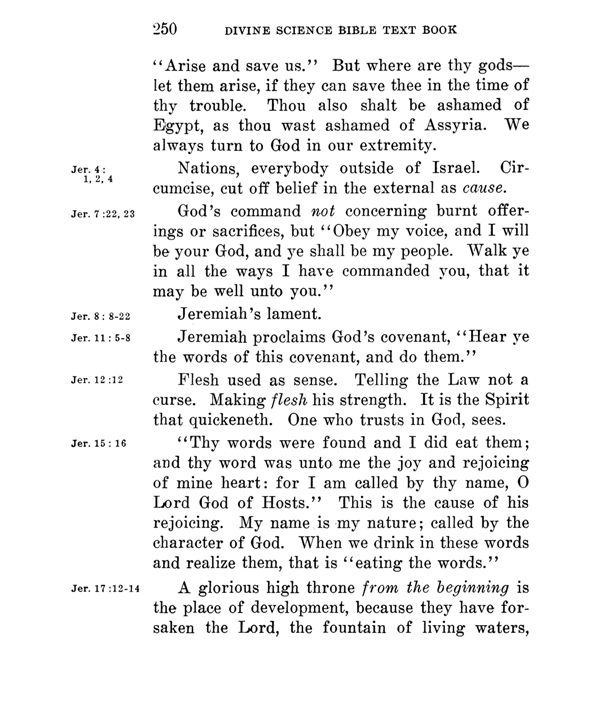 Jer. 4: 1, 2, 4 Jer. 7:22, 23 Jer. 8: 8-22 Jer. 11: 5-8 Jer. 12:12 Jer. 15: 16 Jer. 17:12-14 |