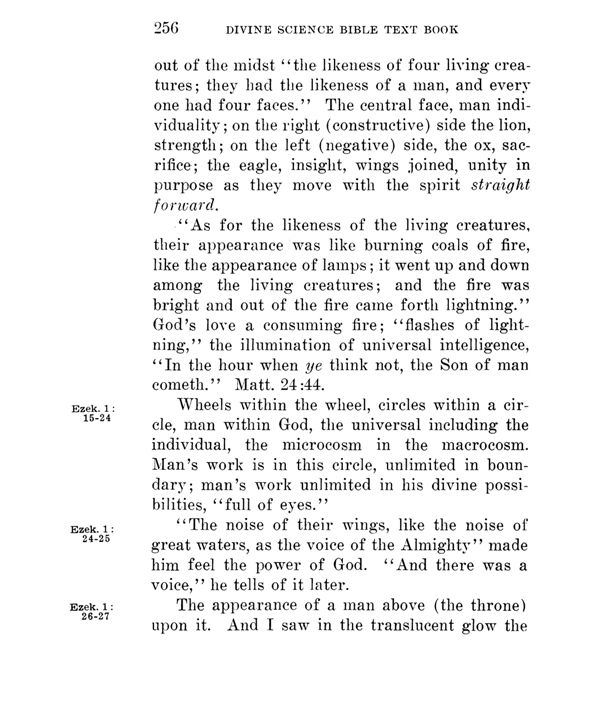 "As for the likeness of the living creatures, their appearance was like burning coals of fire, like the appearance of lamps; it went up and down among the living creatures; and the fire was bright and out of the fire came forth lightning." God's love a consuming fire; "flashes of lightning," the illumination of universal intelligence, "In the hour when ye think not, the Son of man cometh." Matt. 24:44.