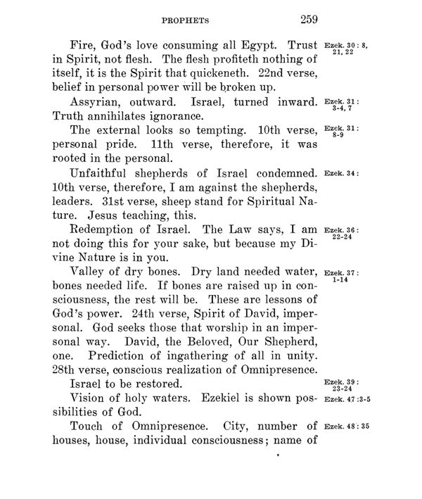 Valley of dry bones. Dry land needed water, bones needed life. If bones are raised up in consciousness, the rest will be. These are lessons of God's power. 24th verse, Spirit of David, impersonal. God seeks those that worship in an impersonal way. David, the Beloved, Our Shepherd, one. Prediction of ingathering of all in unity. 28th verse, conscious realization of Omnipresence.