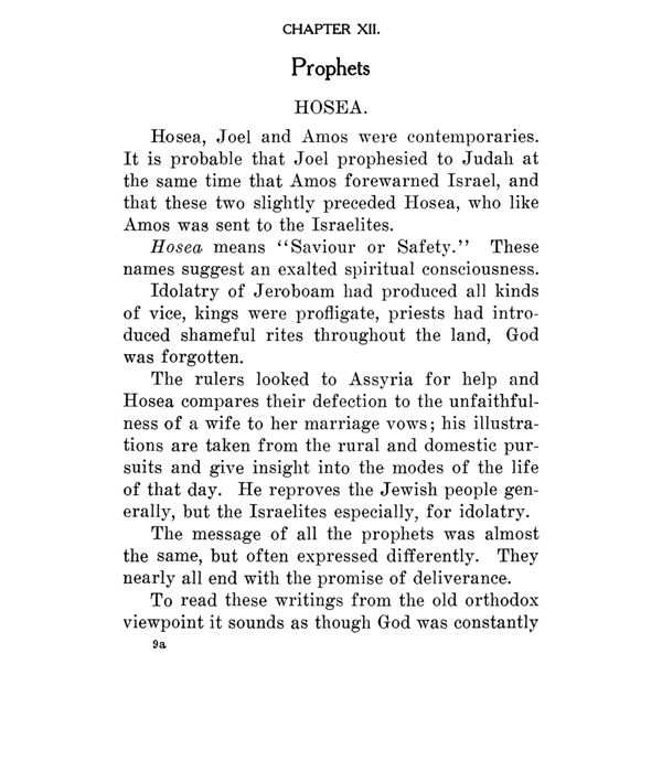 The rulers looked to Assyria for help and Hosea compares their defection to the unfaithfulness of a wife to her marriage vows his illustrations are taken from the rural and domestic pursuits and give insight into the modes of the life of that day. He reproves the Jewish people generally, but the Israelites especially, for idolatry. The message of all the prophets was almost the same, but often expressed differently. They nearly all end with the promise of deliverance. To read these writings from the old orthodox viewpoint it sounds as though God was constantly