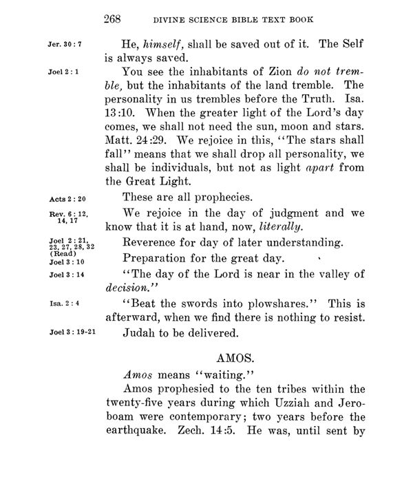 Acts 2: 20 Rev. 6: 12, 14, 17 Joel 2: 21, 23, 27, 28, 32 (Read) Joel 3: 10 Isa. 2: 4 Joel 3: 14 Joel 3: 19-21 |