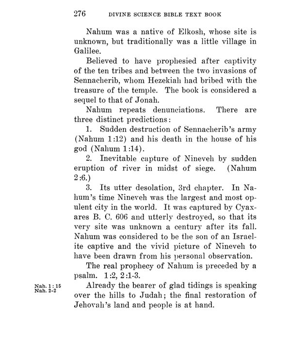 3. Its utter desolation, 3rd chapter. In Nahum's time Nineveh was the largest and most opulent city in the world. It was captured by Cyaxares B. C. 606 and utterly destroyed, so that its very site was unknown a century after its fall. Nahum was considered to be the son of an Israelite captive and the vivid picture of Nineveh to have been drawn from his personal observation.