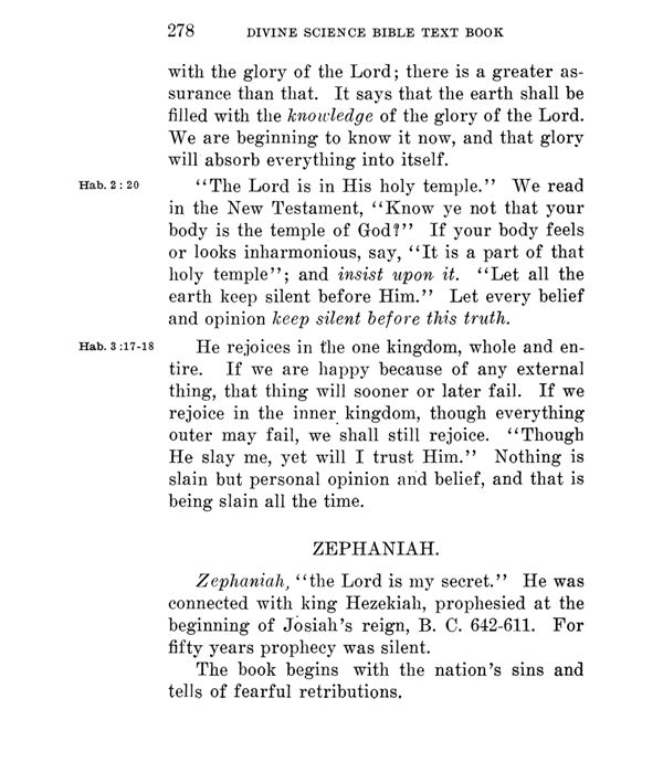 "The Lord is in His holy temple." We read in the New Testament, "Know ye not that your body is the temple of God?" If your body feels or looks inharmonious, say, "It is a part of that holy temple"; and insist upon it. "Let all the earth keep silent before Him." Let every belief and opinion keep silent before this truth.