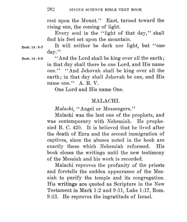 Malachi reproves the profanity of the priests and foretells the sudden appearance of the Messiah to purify the temple and its congregation. His writings are quoted as Scripture in the New Testament in Mark 1:2 and 9:11, Luke 1:17, Rom. 9:13. He reproves the ingratitude of Israel.