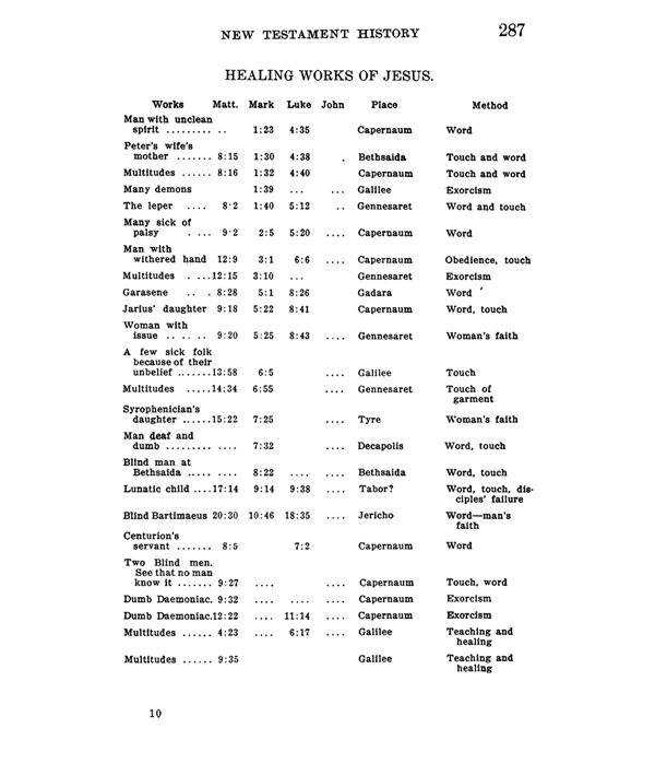| Works | Matt. | Mark | Luke | John | Place | Method |