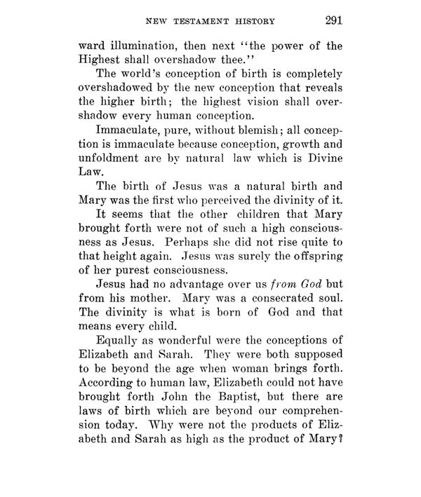 Equally as wonderful were the conceptions of Elizabeth and Sarah. They were both supposed to be beyond the age when woman brings forth. According to human law, Elizabeth could not have brought forth John the Baptist, but there are laws of birth which are beyond our comprehension today. Why were not the products of Elizabeth and Sarah as high as the product of Mary?