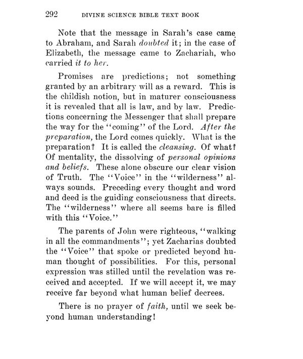 Promises are predictions; not something granted by an arbitrary will as a reward. This is the childish notion, but in maturer consciousness it is revealed that all is law, and by law. Predictions concerning the Messenger that shall prepare the way for the "coming" of the Lord. After the preparation, the Lord comes quickly. What is the preparation? It is called the cleansing. Of what? Of mentality, the dissolving of personal opinions and beliefs. These alone obscure our clear vision of Truth. The "Voice" in the "wilderness" always sounds. Preceding every thought and word and deed is the guiding consciousness that directs. The "wilderness" where all seems bare is filled with this "Voice."