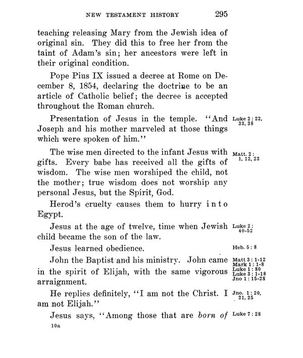 Luke 2: 22, 33, 38 Matt. 2: 1, 12, 23 Luke 2: 40-52 Heb. 5: 8 Matt 3: 1-12 Mark 1: 1-8 Luke 1: 80 Luke 3: 1-18 Jno 1: 15-28 Jno. 1: 20, 21, 25 Luke 7: 28 |