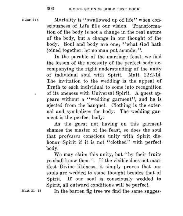 In the parable of the marriage feast, we find the lesson of the necessity of the perfect body accompanying the right understanding of the unity of individual soul with Spirit. Matt. 22:2-14. The invitation to the wedding is the appeal of Truth to each individual to come into recognition of its oneness with Universal Spirit. A guest appears without a "wedding garment", and he is ejected from the banquet. Clothing is the external and symbolizes the body. The wedding garment is the perfect body.