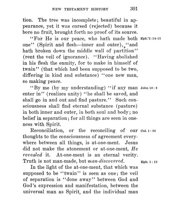 "For He is our peace, who hath made both one" (Spirit and flesh --- inner and outer),." and hath broken down the middle wall of partition" (rent the veil of ignorance). "Having abolished in his flesh the enmity, for to make in himself of twain" (that which had been supposed to be two, differing in kind and substance) "one new man, so making peace.