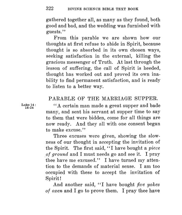 From this parable we are shown how our thoughts at first refuse to abide in Spirit, because thought is so absorbed in its own chosen ways, seeking satisfaction in the external, killing the gracious messenger of Truth. At last through the lesson of suffering, the call of Spirit is heeded, thought has worked out and proved its own inability to find permanent satisfaction, and is ready to listen to a better way.