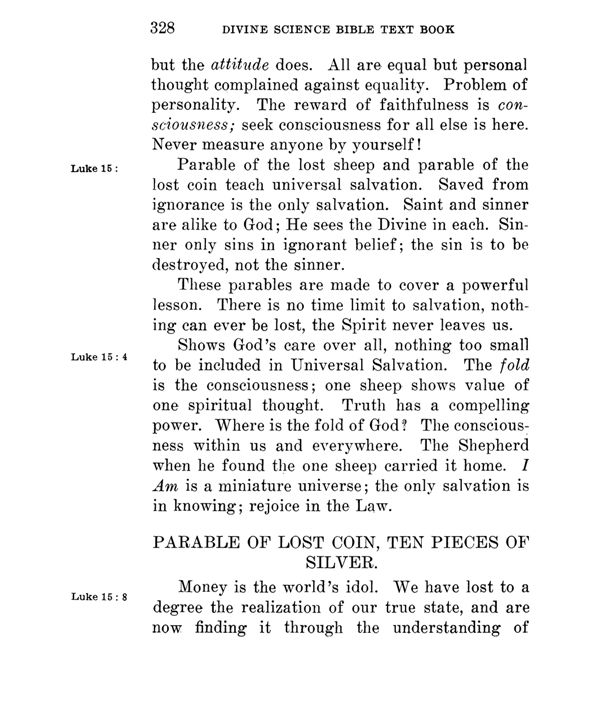 Shows God's care over all, nothing too small to be included in Universal Salvation. The fold is the consciousness; one sheep shows value of one spiritual thought. Truth has a compelling power. Where is the fold of God? The consciousness within us and everywhere. The Shepherd when he found the one sheep carried it home. I Am is a miniature universe the only salvation is in knowing; rejoice in the Law.