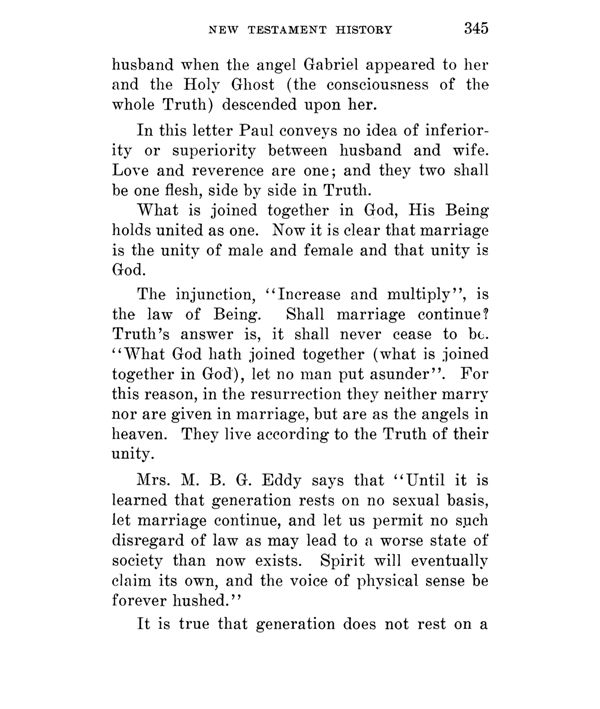 The injunction, "Increase and multiply", is the law of Being. Shall marriage continue? Truth's answer is, it shall never cease to be. "What God hath joined together (what is joined together in God), let no man put asunder". For this reason, in the resurrection they neither marry nor are given in marriage, but are as the angels in heaven. They live according to the Truth of their unity.