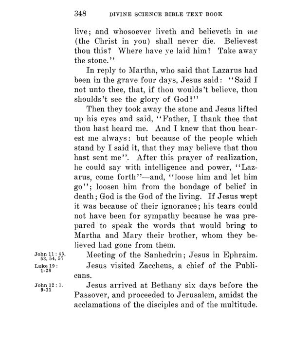 Then they took away the stone and Jesus lifted up his eyes and said, "Father, I thank thee that thou hast heard me. And I knew that thou hear est me always: but because of the people which stand by I said it, that they may believe that thou hast sent me". After this prayer of realization, he could say with intelligence and power, "Lazarus, come forth" --- and, "loose him and let him go"; loosen him from the bondage of belief in death; God is the God of the living. If Jesus wept it was because of their ignorance; his tears could not have been for sympathy because he was prepared to speak the words that would bring to Martha and Mary their brother, whom they believed had gone from them.