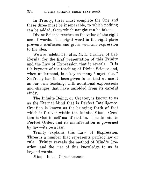 We are indebted to Mrs. M. E. Cramer, of California, for the first presentation of this Trinity and the Law of Expression that it reveals. It is the keynote of the teaching of Divine Science and, when understood, is a key to many "mysteries." So freely has this been given to us, that we use it as our own teaching, with additional expressions and changes that have unfolded from its careful study.