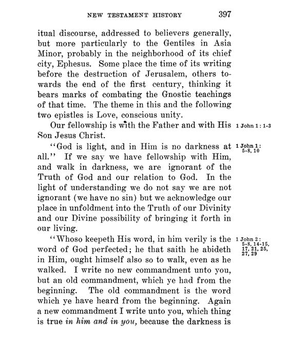 discourse, addressed to believers generally, but more particularly to the Gentiles in Asia Minor, probably in the neighborhood of its chief city, Ephesus. Some place the time of its writing before the destruction of Jerusalem, others towards the end of the first century, thinking it bears marks of combating the Gnostic teachings of that time. The theme in this and the following two epistles is Love, conscious unity.