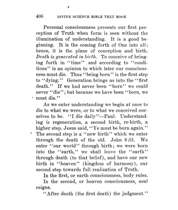 As we enter understanding we begin at once to die to what we were, or to what we conceived ourselves to be. "I die daily" --- Paul: Understanding is regeneration, a second birth, re-birth, a higher step. Jesus said, "Ye must be born again." The second step is a "new birth" which we enter through the death of the old. John 8:51. We enter "our world" through birth; we were born into the "earth," we shall leave the "earth" through death (to that belief), and have our new birth in "heaven" (kingdom of harmony), our second step towards full realization of Truth.