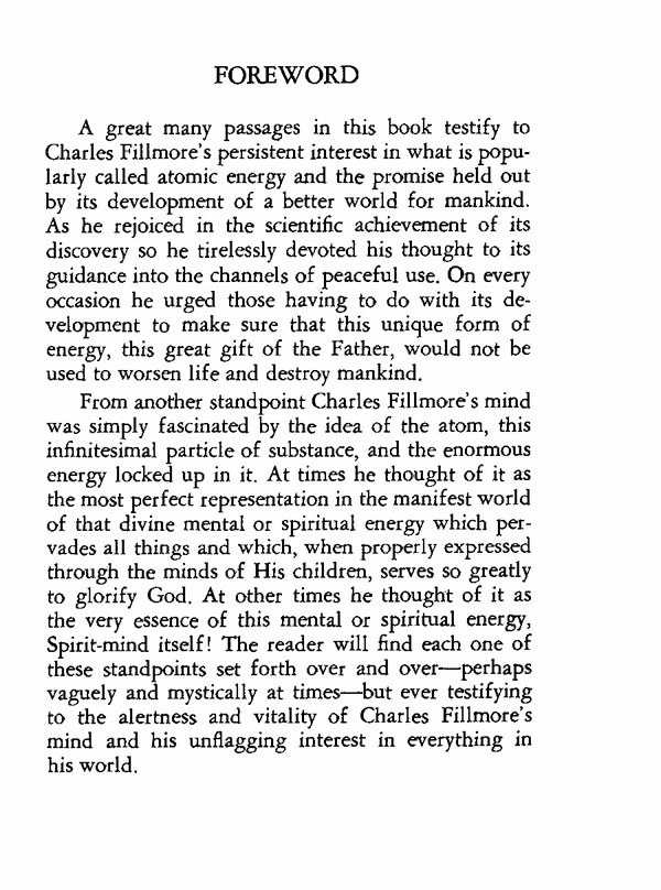 A great many passages in this book testify to Charles Fillmore's persistent interest in what is popularly called atomic energy and the promise held out by its development of a better world for mankind. As he rejoiced in the scientific achievement of its discovery so he tirelessly devoted his thought to its guidance into the channels of peaceful use. On every occasion he urged those having to do with its development to make sure that this unique form of energy, this great gift of the Father, would not be used to worsen life and destroy mankind.